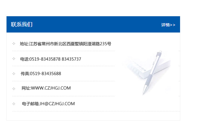 地址:常州市新北區友邦商務大廈1幢16、17層  電話:0519-85101652  傳真:0519-85112595  郵編:213022  網址:www.cz-jiayue_cn.ywzdqc.com  郵箱:xiajifengaa@163.com